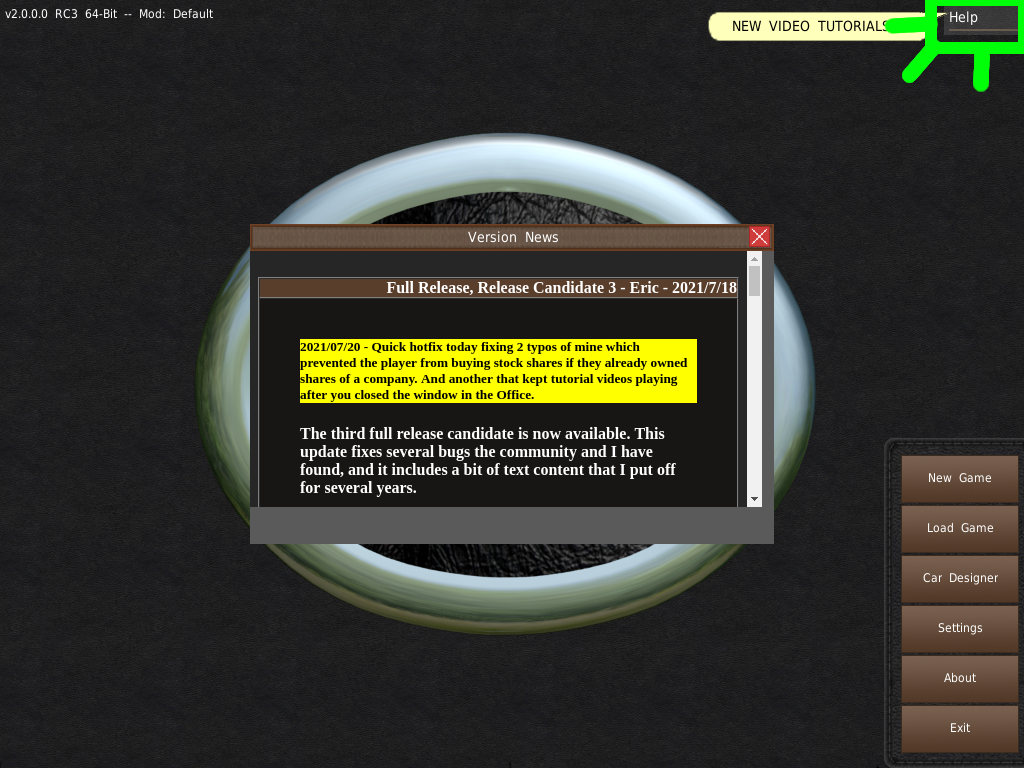 最後に、画面の右上に緑色に光るヘルプボタンがあります。ヘルプボタンをクリックすると、ヘルプメニューが表示されます。ヘルプメニューでは、チュートリアルを無効にしたり、オンラインマニュアルを読んだり、ルームのホットキーを表示したり(メインメニューやニューゲーム画面では利用できません)、チャットルームを開いたりすることができます。このメニューは、ゲームのどの部分でもアクセスできます。