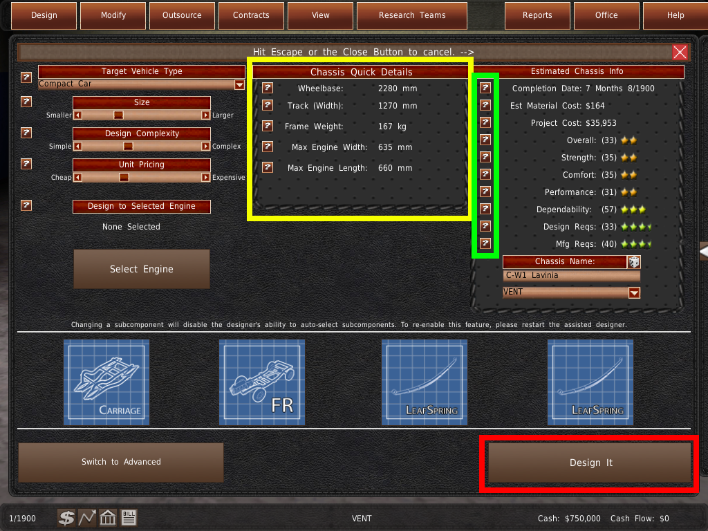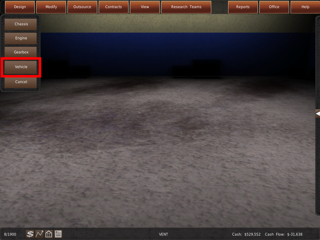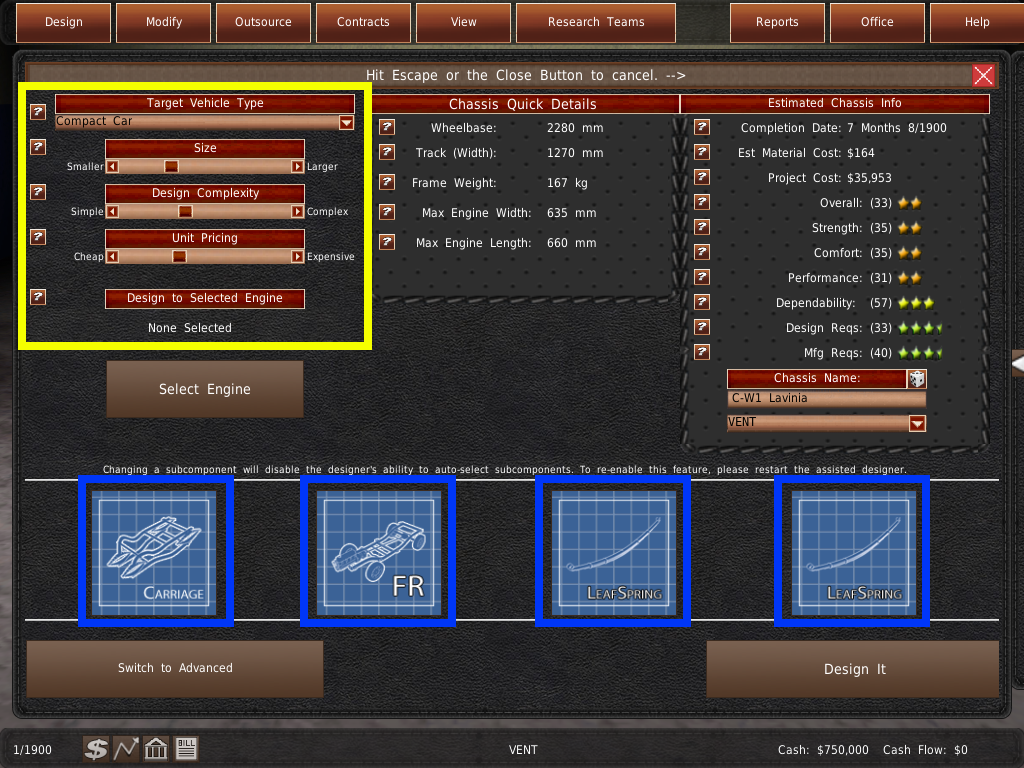 GearCity の車両には、シャーシ、エンジン、ギアボックスの 3 つの主要コンポーネント(部品)が必要です。車両を設計するためには、これらのコンポーネントが一緒に動作する必要があります。例えば、エンジンの寸法は、シャーシがサポートする最大値よりも小さくなければなりません。そうしないと、コンポーネントが連動しないため、車両を設計することができません。