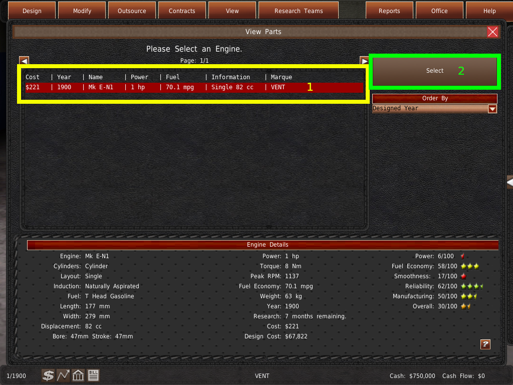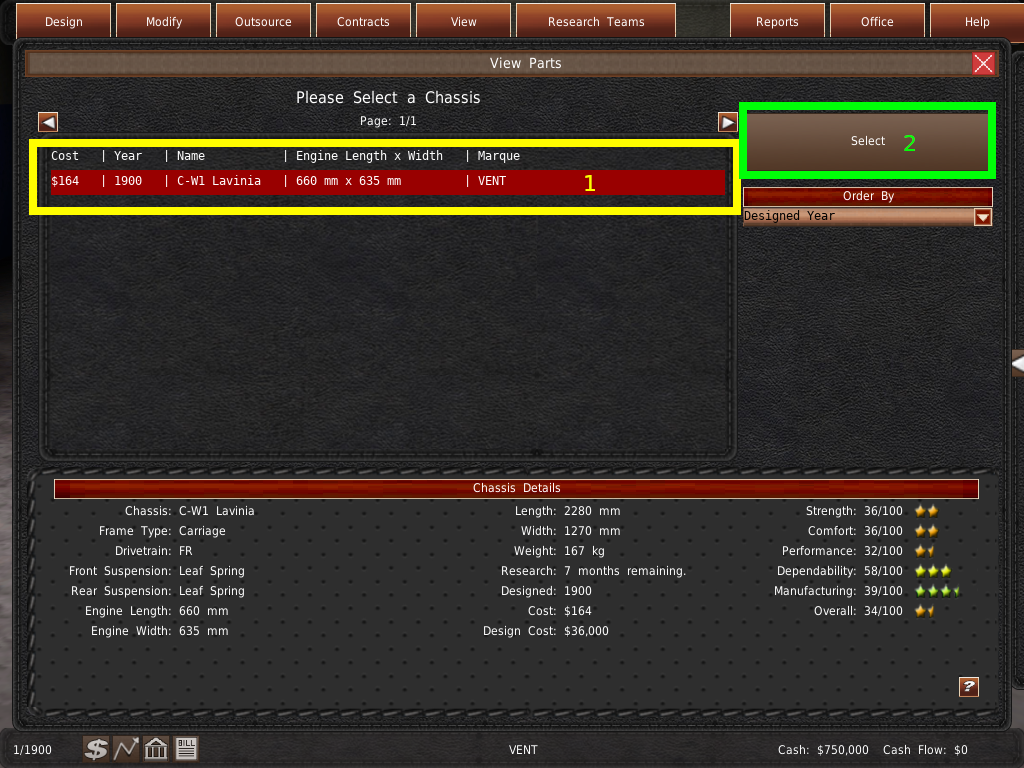 一番上のリストには、シャーシ、エンジン、ギアボックスの3つのプロジェクトが表示されているはずです。この3つの部品が完成しないと、車両の開発は始まりません。一番長く開発している部品の月数分だけスキップする必要があります。