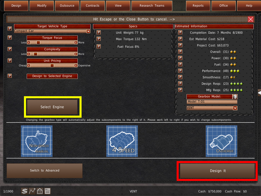 ギアボックスデザイナーの ターゲットの車種ドロップダウンからセダンを選択します。これでギアボックスのデザインができました。エンジンと同様に、総合評価が2つ星になるようにします。デザインが完成したら、赤く光る設計するボタンをクリックします。