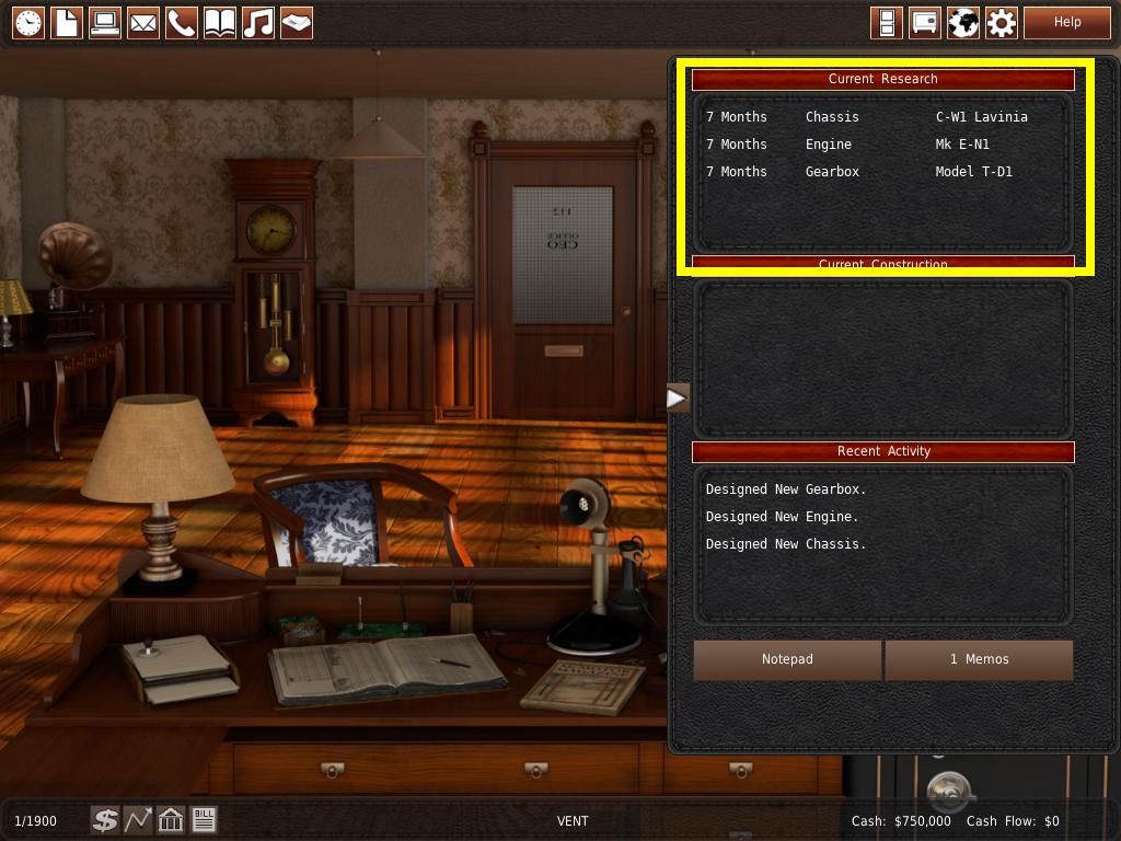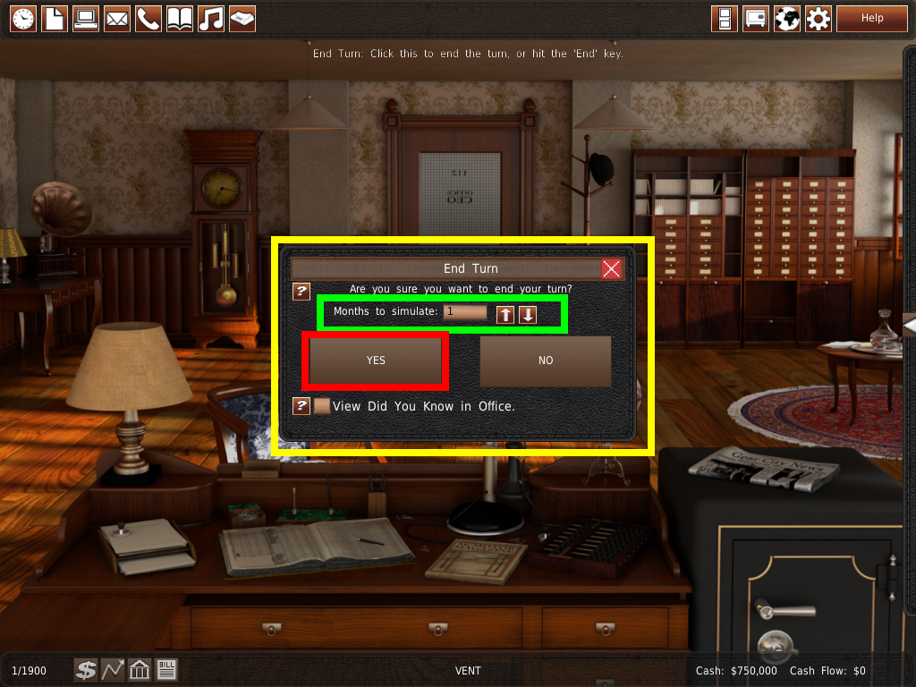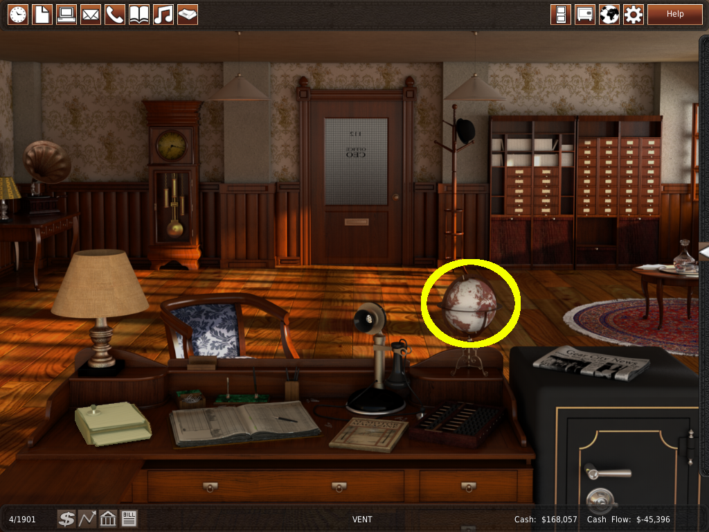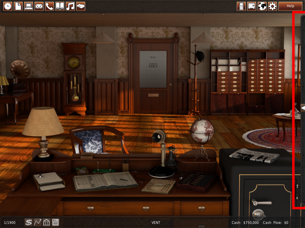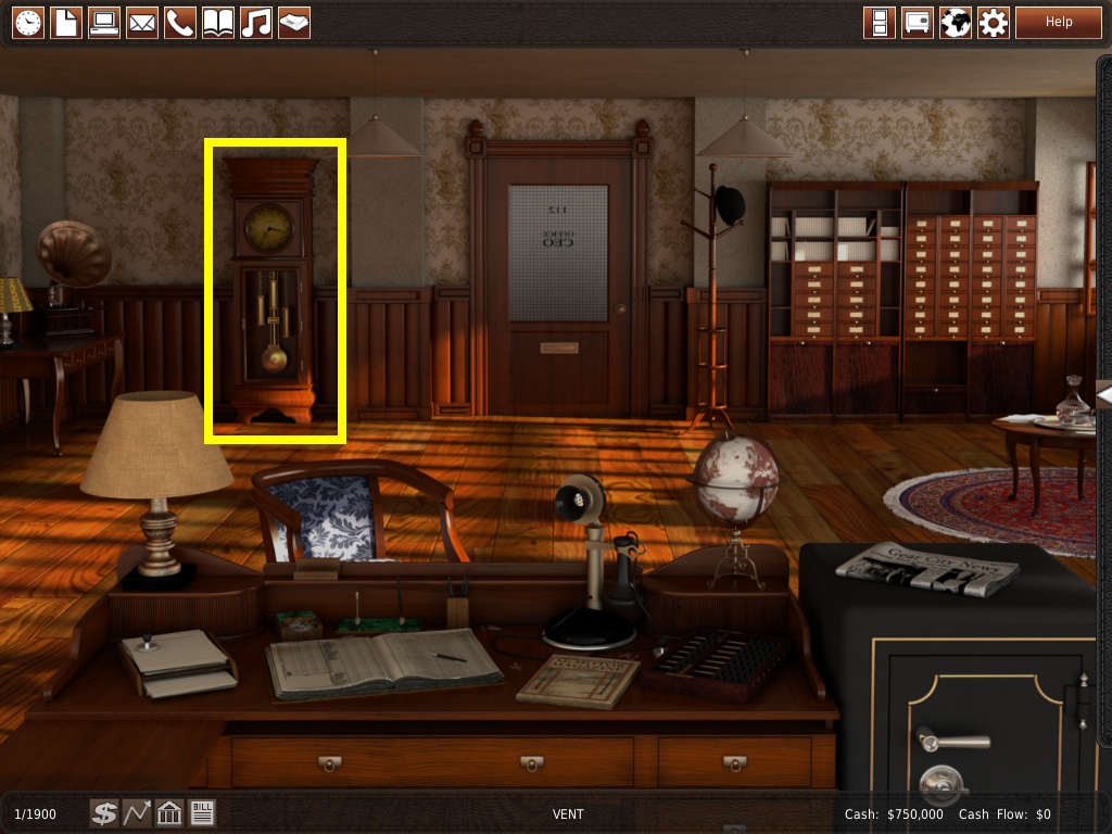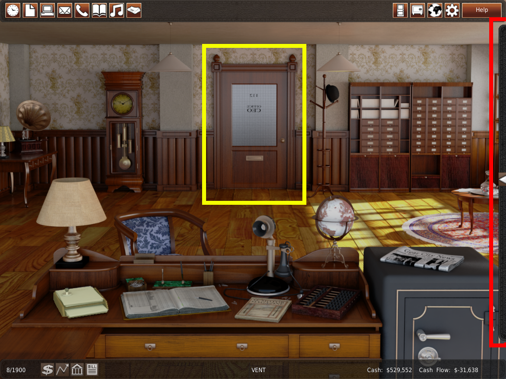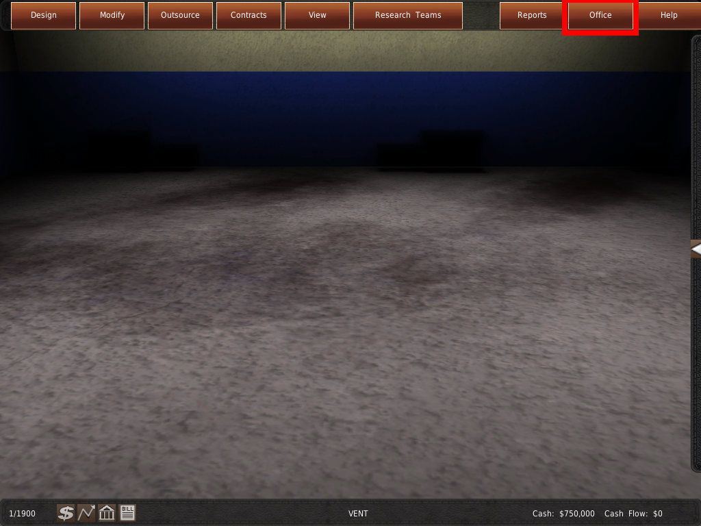 この部屋は、会社を運営する上で重要な役割を果たします。ワールドマップ に実装されているほとんどの機能は、オフィスのメガメニュー(コンピュータ)で行うことができます。しかし、ワールドマップの方が視覚的にわかりやすく、使いやすいのです。初心者の方は、ゲームに慣れるまではワールドマップ を使ってみてください。