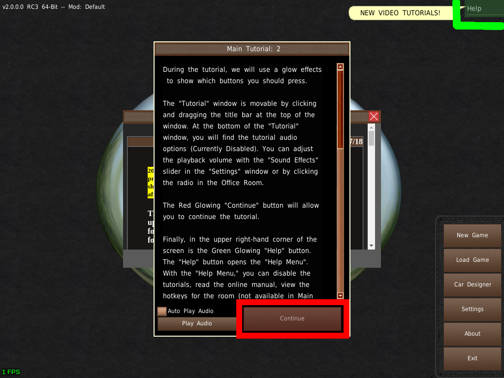 チュートリアルウィンドウは、ウィンドウ上部のタイトルバーをクリックしてドラッグすることで移動できます。チュートリアル ウィンドウの下部には、チュートリアルのオーディオオプションがあります(現在は無効)。再生音量は、設定ウィンドウのSE音量スライダー、またはオフィスルームのラジオをクリックすることで調整できます。