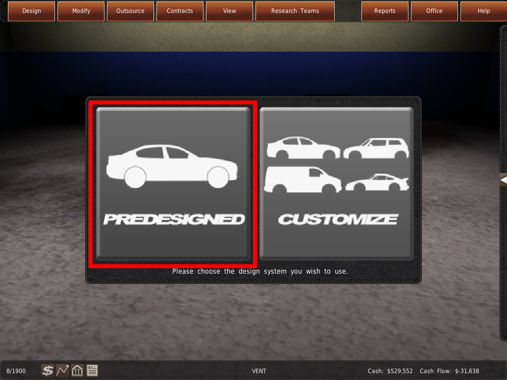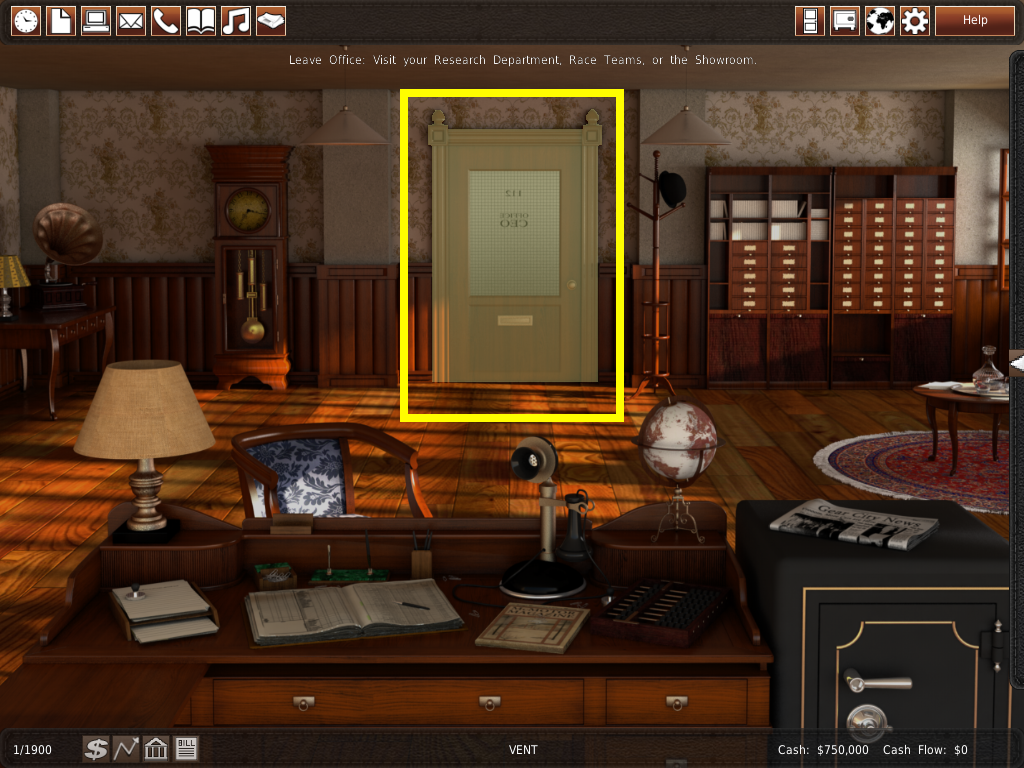 あなたは自動車メーカーを経営しているのですから、車両を設計しなければなりません。車両や部品を設計するためには、研究開発部に行かなければなりません。黄色く光るドアをクリックして、ドアメニューを表示します。その後、赤く光る研究開発部ボタンをクリックして次に進みます。