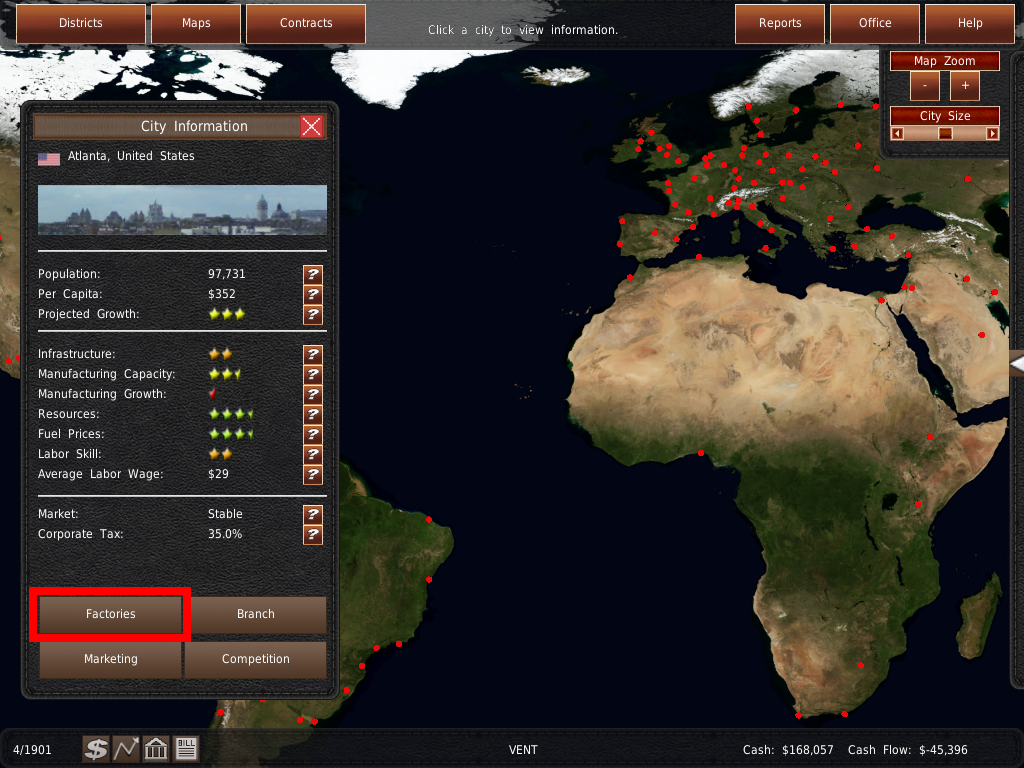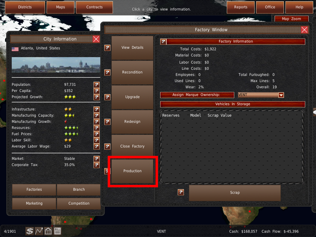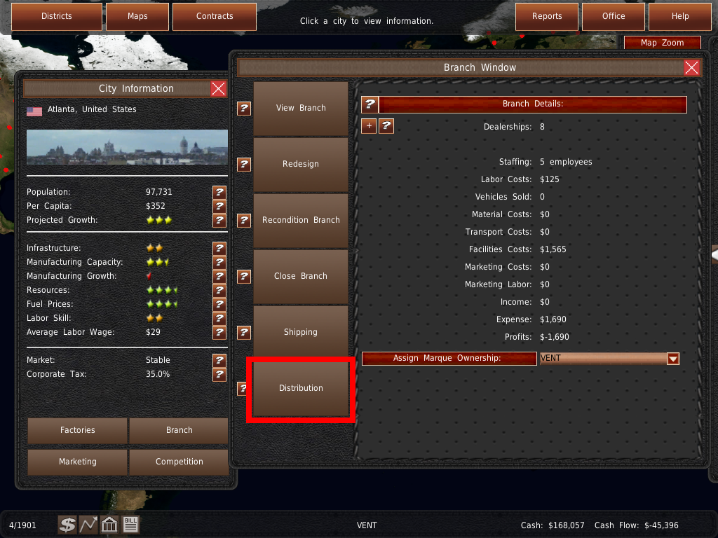 ワールドマップ では、工場や支店の管理、メンテナンス、建設、閉鎖などを行うことができます。また、マーケティングシステムや、車両の製造・販売を管理する場所でもあります。また、ワールドマップ には、都市や競合他社のビジュアルデータマップも含まれています。