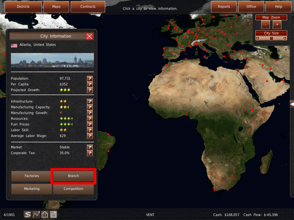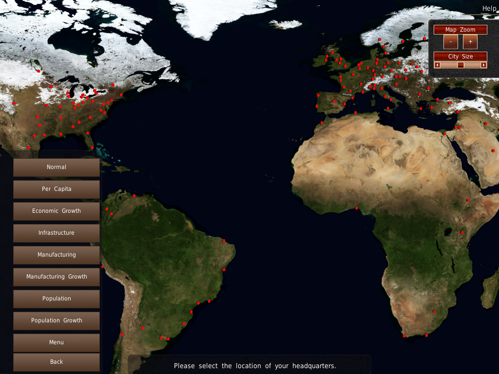 ここでは、あなたの会社の本社を選択する必要があります。ゲームの設定に応じて、この場所にスタート工場と支店が設置されます。また、戦争中の軍事契約や税率などにも影響します。