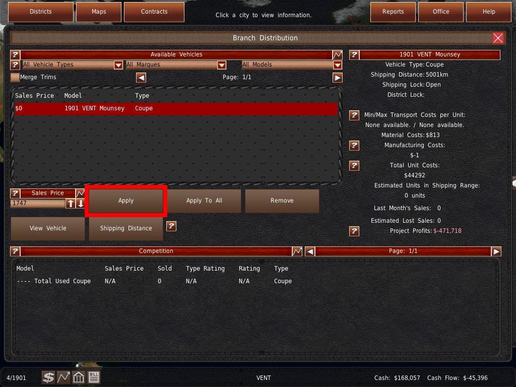最後に、車両モデルを販売するには、販売価格のテキストボックスに価格を設定し、赤く光る適用ボタンを押して変更を保存します。なお、選択した都市の一人当たりの所得の5倍以上の価格を設定してはいけません。販売価格が高ければ高いほど、購入できる人が少なくなります。
