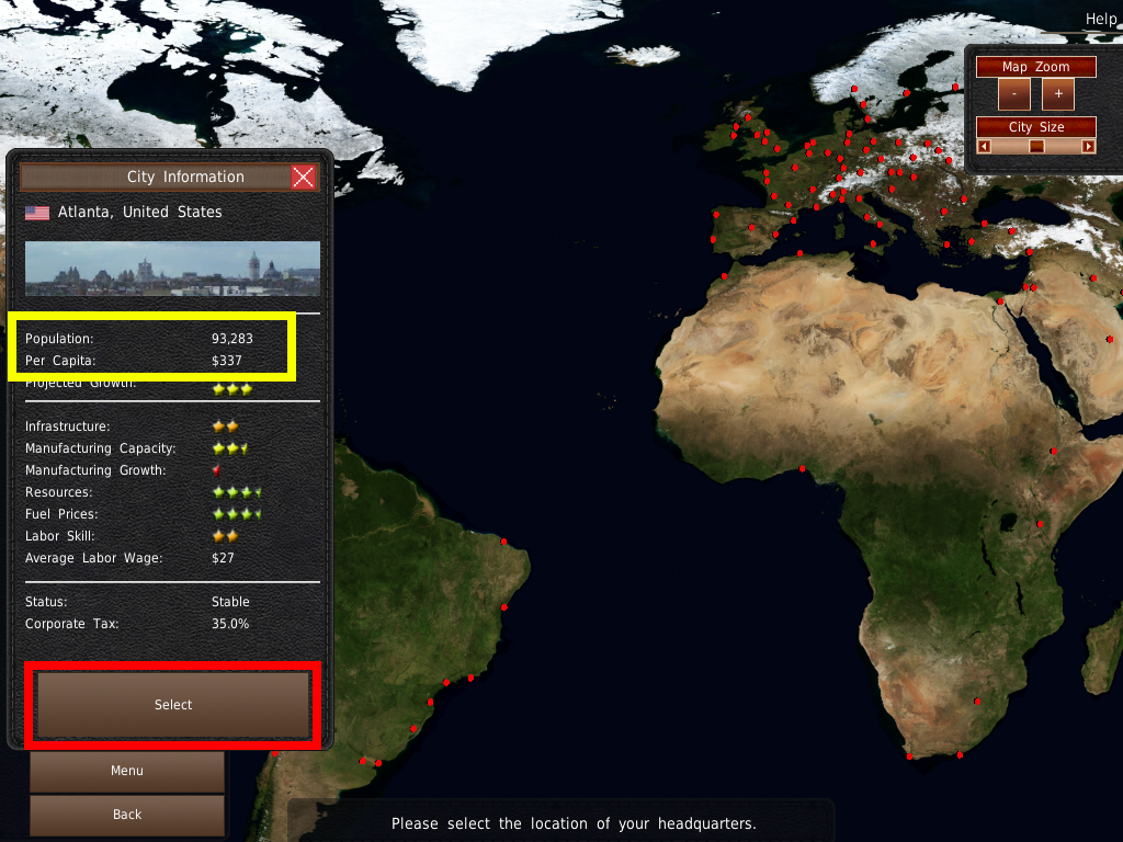 都市を見つけたら、都市情報ウィンドウで赤く光る 選択ボタンをクリックしてください。