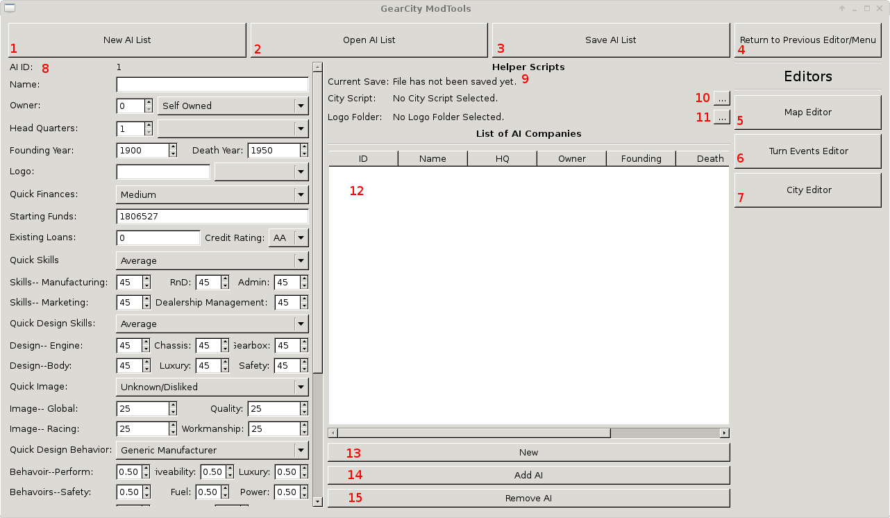 The AI has lots of variables stored in the AI.xml files. These variables distinguish one company from the next. The following will break down the editable variables found in the variable panel (#8 in this picture).